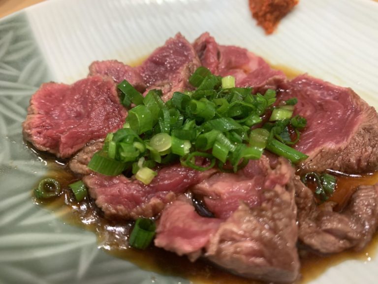 2品目は牛のたたき。これで350円ですよ、しっかり写真を見てください。めちゃくちゃにうまい。焼肉店で食べたら1,000円位取られるんじゃないでしょうか?