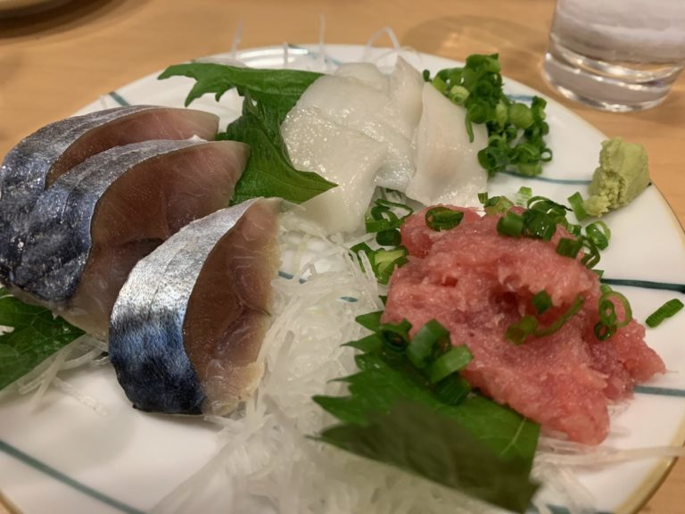 今日はねぎとろ、シメサバ、えんがわの3点盛りでした。シメサバが本当に美味しかった。いつも書いていますがこれで500円。