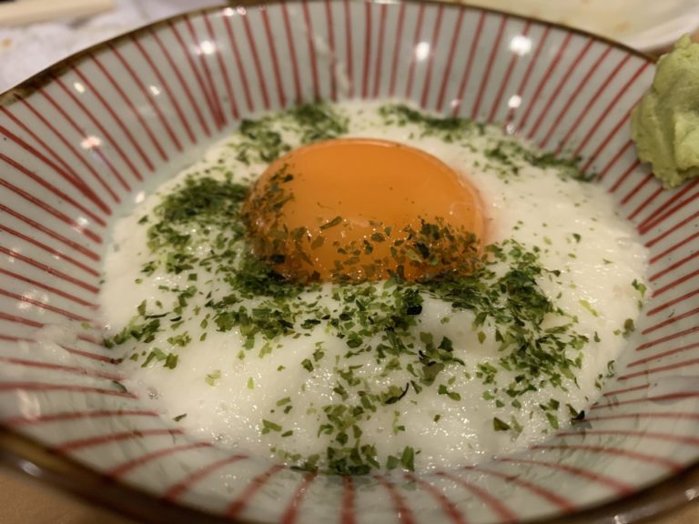 今日の締めは山芋月見。向島かどやさんの山芋月見を見てください。